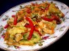 Очищенные картофелины разрезаем на четыре части и затем режем тонкими ломтиками. Лук режем тонкими полукольцами. Кабачки режем вдоль на четыре части, потом нарезаем такими же ломтиками, как и картофель.