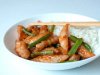 Для соуса смешиваем крахмал и воду, табаско, соевый соус, кунжутное масло. Перемешиваем и добавляем томатную пасту и сахар. Доводим до кипения и даем соусу загустеть. Заливаем соусом куриное мясо (его нужно выложить в глубокую посуду) и фасоль и сразу же подаем с рисом.