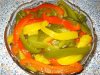 Морковку почистить и порезать небольшими кубиками, точно так же порезать и весь болгарский перец, положить их в кастрюльку, залить горячей водой и поставить на средний огонь. После того, как бульон закипит, посолить его и через 5 минут добавить нарезанный такими же кубиками цуккини (кабачок), а еще через 3 минутки положить в кастрюлю горошек, затем довести до кипения и снять с огня. Готовые овощи откинуть на дуршлаг и подождать пока они остынут.