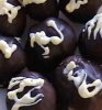 Тем временем растопить на водяной бане черный шоколад и добавить в него сливки и обмакнуть конфеты в глазури, наколов их на вилку или специальную палочку, потом подождать пока глазурь на конфетах застынет и украсить их стружкой, посыпкой и растопленным белым шоколадом.