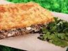 Огнеупорную форму немного смазать маслом, выложить половину теста, затем начинку и накрыть тестом. Разровнять.