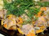 После выложить мясо в широкую чугунную форму одним слоем и залить растительным маслом так, чтобы оно полностью покрыло свинину; сверху прикрыть листом пергамента, закрыть крышкой и поставить в разогретую до 130 градусов духовку на 45 минут. Спустя положенное время положить к мясу разрезанную на две части головку чеснока и снова также накрыв продолжать готовить еще в течение двух с половиной часов.