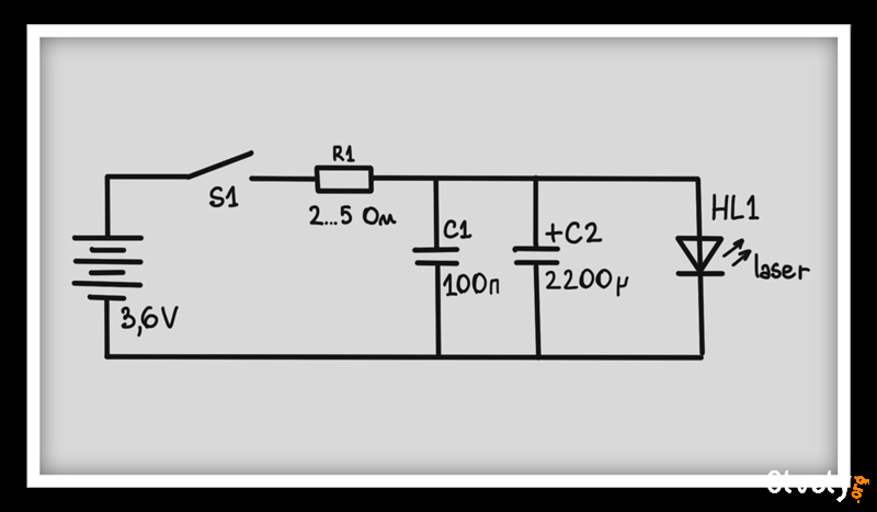 2. Дальше переходите к сборке схемы. Она нужна, чтобы можно было контролировать мощность готового лазера. В противном случае ваш лазер просто сгорит. Чтобы не заморачиваться со схемой, можете сделать простой навесной монтаж.