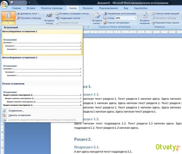 4. В верхнем меню выберите такой раздел, как «Ссылки» а затем щелкните по пункту «Оглавление». Из предложенных вариантов выберите автоматическое (либо автоматически собираемое) оглавление (первый или второй пункт), после чего щелкните по выбранному пункту.