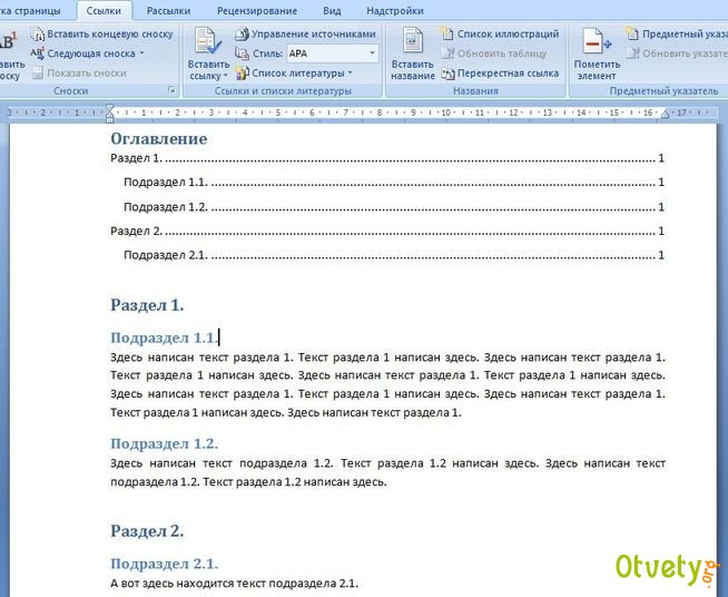 3. После этого выделите такой текст: «Подраздел 1. 1». Аналогичным образом, описанным во втором пункте, задайте данному тексту следующий стиль «Заголовок 2».