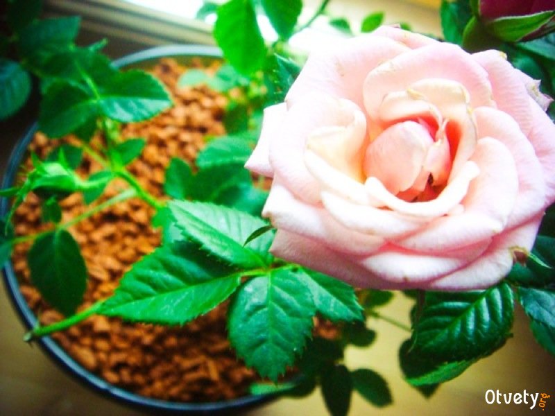 2. Как создать наиболее оптимальные условия для нормального развития розы комнатной? Ниже хочется привести несколько советов по выращиванию розы и уходом за ней. Одним из самых важных условий для нормального роста и развития растения является оптимальная температура. Избегайте его перегрева, даже в зимние месяцы. Учитывайте тот факт, что роза может вынести даже небольшие заморозки, но в жаре она погибнет. Идеальной температурой для роста и развития цветка является плюс двадцать пять градусов. Лучше всего поставить розу на хорошо освещенный подоконник, но в полдень обязательно прикрывайте растение от прямых солнечных лучей и обязательно время от времени в жаркие месяцы проветривайте помещение. Самым лучшим вариантом размещения розы комнатной станет окно, находящееся на востоке или западе. Не нужно ставить ее на окно с южной стороны – он палящих лучей ее не спасет ни полив, ни проветривание. Вскоре листья на розе пожелтеют и опадут, а бутоны вообще не будет образовываться. Переставить горшок с цветком на южное окно можно только поздней осенью или зимой. Поливать розу нужно много и регулярно. Влага – это важнейшее условия для нормального роста и развития розы в домашних условиях. Но не нужно переусердствовать – через полчаса после полива аккуратно слейте ту воду, которая скопиться к тому времени в поддоне. Летом и поздней весной цветок нужно поливать каждый день. Среди цветоводов бытует ошибочное мнение, что розе нужно каждый день опрыскивать листья водой. Это совершенно неправильно – достаточно раз в неделю устраивать цветку банный день для того, чтобы водой из душа сбить пыль. Если земля в горшке с розой будет переувлажнена, то это станет толчком к появлению насекомых - вредителей. Кроме этого, чрезмерно частое опрыскивание листьев приводит к заражению розы грибковыми заболеваниями, которые в свою очередь вызывают болезни и даже гибель всего растения. Помните, что комнатные розы очень требовательны к уходу и довольно прихотливы, поэтому время от времени в почву нужно добавлять удобрения. Это обусловлено, что растение почти все время находиться то в стадии бутонизации, то цветения, поэтому расходует очень много сил и ресурсов – ему просто необходима подкормка. С начала весны и до самых первых морозов обязательно подкармливайте розу минеральными или органическими удобрениями. Для того чтобы приобрести эти удобрения, отправляйтесь в цветочный магазин. Лучше всего подходят для ухода за комнатной розой жидкие удобрения, ассортимент которых широко представлен в специализированных магазинах.