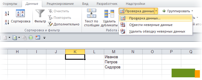 Для того, чтобы создавать раскрывающийся список из выбранного диапазона ячеек нужно использовать команду для Проверки данных в группе с именем Работа с данными, которая находится на вкладке Данные.