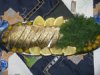 фаршировать его полученной начинкой. Для тог чтобы фарш не лип к рукам, время от времени смачивайте ладони в холодной воде. В этом процессе важно не переусердствовать, потому что если вы набьете в кожу много фарша, то она лопнет в процессе приготовления в духовом шкафу. Не бойтесь, если фарш останется, из него можно приготовить очень вкусные котлеты. Опять же мокрыми руками осторожно разгладьте кожу и постарайтесь придать ей более – менее правдоподобный вид, приложимте к нужному месту отрезанную голову и заверните рыбу в бумагу, действуя очень осторожно. Противень выложите вощеной бумагой и на нее положите вашу щуку, затем отправьте рыбу в духовку, которая должна быть к тому времени разогрета до температуры в 180 градусов. Время, которое понадобиться для полного запекания , составляет от получаса до часа -полтора, в зависимости от размера самой рыбы. Чтобы быть уверенными в готовности, за десять минут до истечения положенного времени, раскройте бумагу и смажьте верх щуки сливочным маслом и больше не заворачивайте. Когда рыба будет готова, достаньте ее и дайте время остыть. После этого, удалите все нитки, которые были использованы и порежьте рыбу на порционные куски. Теперь приступите к украшению вашего вкуснейшего блюда. Листья салата вымойте под проточной водой, затем обсушите на бумажном полотенце. Лимон порежьте очень тонкими дольками и проложите им все куски рыбы. На поверхности кусочков рыбы можно сделать разнообразные узоры и дополнить их половинками оливок.