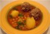 Приготовление. Горох очистите от шкурок, 3 ст. л. гороха разомните вилкой, остальное отложите. Замочите в тёплой воде чернослив, курагу, изюм, барбарис. Смешайте размятый нут с фаршем, рисом, сырым яйцом, мелко рубленным луком, перцем, солью, 1 ч. л. настоя шафрана (разотрите щепотку шафрана в ступке со щепоткой крупной соли, залейте 3 ч. л. кипятка, настаивайте 5 минут). Вымесите фарш, поставьте в холодильник на 20 минут. Сформируйте из фарша два шарика, в каждом из них сделайте большими пальцами углубление, туда положите по половине варёного яйца, ч. л. барбариса и изюма, грецкого ореха, по 1 кураге и черносливине. Закройте кюфту так, чтобы начинка осталась внутри. Нагрейте духовку до 150°С. В горшок с крышкой положите шарики с начинкой, помидоры целиком, залейте бульоном (на 2/3 высоты кюфты), готовьте под крышкой полчаса. Крышку снимите, за 15-20 минут кюфту подрумяньте, поливая жиром с поверхности бульона. Тем временем тонко нарезанный лук обжарьте в топлёном масле, добавьте куркуму, перец, горох нут, влейте оставшийся бульон и настой шафрана, посолите, доведите до кипения, снимите с огня. Подавайте кюфту с кусочками мяса в бульоне или отдельно на тарелочке с нутом.