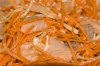 Для приготовления этой закуски необходимо натереть морковку на очень тонкие полоски. В продаже есть специальная тёрка, она так и называется (тёрка для корейской моркови). Если же нет в наличии этой тёрки, то просто нарежьте морковь так тонко, как только сможете.