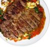 Способ приготовления. Мясо смажьте оливковым маслом, отложите в сторону. Мелко нарежьте лук, обжарьте его с половиной топлёного масла до мягкости на среднем огне, влейте вино, выпарите наполовину. Протрите соус через сито, влейте бульон, добавьте костный мозг, выпарите наполовину, протрите через сито, прогрейте, добавляя кусочки масла (по мере того, как предыдущий кусочек растворится). Посолите, поперчите (белый перец), добавьте мелко рубленную зелень, уберите с огня. Мясо посолите, поперчите (чёрный перец), обжарьте с обеих сторон по 3-4 мин в топлёном масле на средне-сильном огне, переложите в соус, прогрейте пару минут. Подавайте с картофелем.
