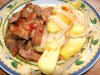 А тем временем сделать зажарочку. Для этого сало меленько порезать и обжарить на сковородке, добавить затем к нему лук репчатый порезанный полуколечками.