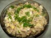 Отдельно нужно почистить картофель и перетереть его на крупной терочке. После этого его нужно залить крутым кипятком, в таком виде оставить примерно на десять минут. За это время сыр перетереть на крупной терочке. Чеснок и лук почистить и порезать меленько. Картофель вынуть и дать стечь воде, соединить его с сыром, чесноком и луком, добавить сметанку.