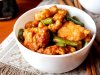 Куриное мясо нарезать кусочками, размером 3 х 3 см и толщиной в 1 см. Смешать вино и соевый соус, добавить имбирь, перемешать и мариновать мясо 30 минут. Мелко нарезать лук. К белкам добавить соль и хорошо взбить в пену. Добавить лук, имбирь и стловую ложку крахмала. Оставшийся крахмал выложить на тарелку. Кусочки курицы достать из маринада, обвалять в крахмале. В сковородке вок сильно раскалить растительное масло, его должно быть столько, чтобы оно покрыло курицу при жарке. Кусочки курицы обмакивать в кляр и обжаривать в кипящем масле. Подавать курицу с гарниром из риса.