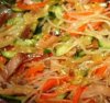 Морковку надо помыть и почистить, затем натереть длинными стружками, как на корейскую морковку. Баклажан помыть и также натереть, как морковку. Перец сладкий промоем и удалим сердцевинку, затем нарежем соломкой. Репчатый лук нужно почистить и порезать полуколечками. Можно еще натереть немного сельдерея.