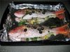 Как запечь рыбу целиком Удалите чешую и жабры. Выберите такую форму для запекания, которая могла бы служить и сервировочным блюдом. Смажьте ее растительным маслом, поместите рыбу в середину, нафаршируйте ее ломтиками лимона, пряными травами, приправьте солью, молотым черным перцем и своими любимыми приправами. Сверху обмажьте растительным маслом.