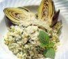 Выньте артишоки из воды. Нарежьте лук-шалот тонкими полукольцами, смешайте с картофелем и артишоками.