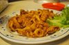 Тушки кальмаров чистят и нарезают кольцами толщиной в 1 см. Кольца посыпают карри, хорошо перемешивают. Затем готовят кляр: яйцо взбивают с солью, добавляют муку, 1/2 стакана воды, взбивают.