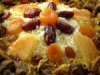 Рис залейте кипятком и оставьте без огня на 15 - 20 минут не перемешивая. Морковь натрите на крупной тёрке, лук мелко нарежьте. Мясо порежьте на небольшие кусочки и обжарьте на сильном огне, пока не образуется корочка. Отдельно обжарьте лук и морковь. Рис слейте в дуршлаг. В кастрюлю с кипящей подсоленной водой положите рис и варите в течении 3 - 5 минут. Затем рис слейте в дуршлаг и промойте его холодной водой. На дно кастрюли положите слой моркови, затем слой лука, слой мяса, слой риса и специи для плова. Вилкой сделайте до дна 3 отверстия, в которые налейте 1 стакан кипятка и добавьте кусочки сливочного масла. Кастрюлю закройте крышкой и варите плов 20 - 25 минут не перемешивая. Когда плов будет готов, всё перемешайте и посолите по вкусу.