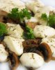 Далее обмываем и нарезаем на половинки грибочки. Опять же грибы для этого рецепта подойдут любые. Итак, обмытые и нарезанные грибы обжариваем на сковороде на растительном масле. Солим и перчим их.