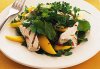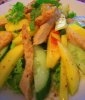 Затем на широкое блюдо выкладываем кусочки жареной рыбы, а сверху выкладываем кусочки обжаренного манго. Украшаем блюдо петрушкой мелко нарубленной.