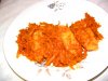 Тем временем готовим маринад для лосося. Нарезаем мелко укроп, с апельсинов выдавливаем сок и натираем цедру одного апельсина. Две дольки чеснока пропускаем через пресс, перец болгарский моем, сушим и нарезаем на соломку (сердцевину удаляем). Все эти ингредиенты смешиваем в глубокой миске, добавляем вино, вустерский соус, соль, перец белый, нарезанный лук порей.