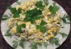 На широкое блюдо укладываем мясо, манго, огурец. Сверху салат поливаем нашим подготовленным соусом.