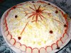 Приступаем к оформлению салата. Голову и хвост рыбки покрыть натертой морковкой. Туловище сделать полосатым, чередуя белые полоски из белка с оранжевыми из морковки. Для контраста проложить между ними тоненькую полосочку из морской капусты. Глазки сделать из кружочков маслин, рот из морской капусты, из морковки вырезать плавнички.