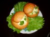 У булочек срезать верхушки и достать мякиш, толщина стенки должна быть примерно 1 см. В булочки уложить лук, грибы, курицу, специи, залить сметаной. Все аккуратно перемешать . Посыпать тертым сыром.