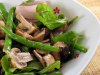 Готовим блюдо. Для начала необходимо очистить лук и нарезать его соломкой. Разогреваем сковороду, наливаем немного оливкового масла и кладём лук. Затем нарезаем на средние кусочки мясо (промытое и обсушенное) и отправляем мясо в сковороду. Спаржевую фасоль моем и нарезаем каждый стручок пополам. Кабачок очищаем от кожицы и нарезаем полукольцами. Отправляем и фасоль и кабачок в сковороду. Солим и перчим все ингредиенты. Посыпаем специями.