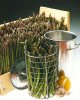Очистите нижнюю часть спаржи, отрежьте твердую часть стебля. Спаржу вымойте, опустите ее в кипящую подсоленную воду и варите 10-15 мин. Еще вариант: разделите спаржу на 4 части. Свяжите каждую часть нитками. Поставьте вязанки спаржи в кастрюлю, добавьте воды (верхушки не должны быть покрыты водой). Варите под закрытой крышкой.