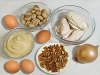 Для начала необходимо отварить куриное мясо в солёной воде. Затем мясо охлаждаем. Грибочки нарезаем пластинками и обжариваем в растительном масле на сковороде. Теперь займёмся приготовлением лука фри. Чистим луковицу, нарезаем крупными кольцами. Распускаем колечки и каждое колечко обваливаем в муке.
