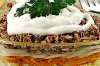Берём плоское блюдо и выкладываем слои: рыба (солим её и выдавливаем немного сока лимонного). Сверху присыпаем луком, затем морковью. Смазываем салат майонезом. Теперь выкладываем яйца и опять украшаем салат майонезом (делаем сеточку).
