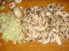 Для начала нам необходимо приготовить омлет, которым мы впоследствии и будем фаршировать кальмары. Для этого грибочки моем и как можно мельче нарезаем. Режем и репчатый лук. Теперь необходимо обжарить лук и грибами. Сладкий перец тоже моем, удаляем семена и хвостик, нарезаем мелкой соломкой и отправляем в сковороду к грибам с луком. Блюдо солим и перчим.