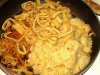 Теперь в блюдце смешиваем соевый соус, немного воды и томатную пасту. Каждый кальмар обмакиваем в этой подливе и выкладываем на сковороду разогретую с растительным маслом. Затем оставшейся подливой заливаем наши фаршированные кальмары. Готовим их под накрытой крышкой минут пять.