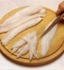2. Помойте рыбу и переложите ее в сковороду. Налейте 150 мл рыбного бульона и быстро доведите до кипения. Готовьте рыбу в бульоне на слабом огне 8-10 минут. Затем выложите рыбу и разделите ее вилкой на мелкие кусочки. Бульон процедите через сито и отставьте в сторону.